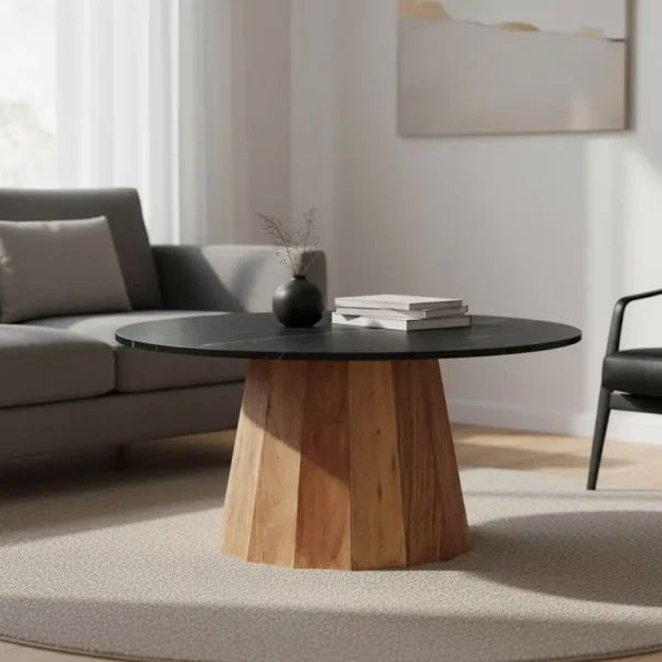 Τραπέζι σαλονιού Ezerdian μασίφ ξύλο ακακίας σε φυσική απόχρωση με επιφάνεια μαύρου μαρμάρου