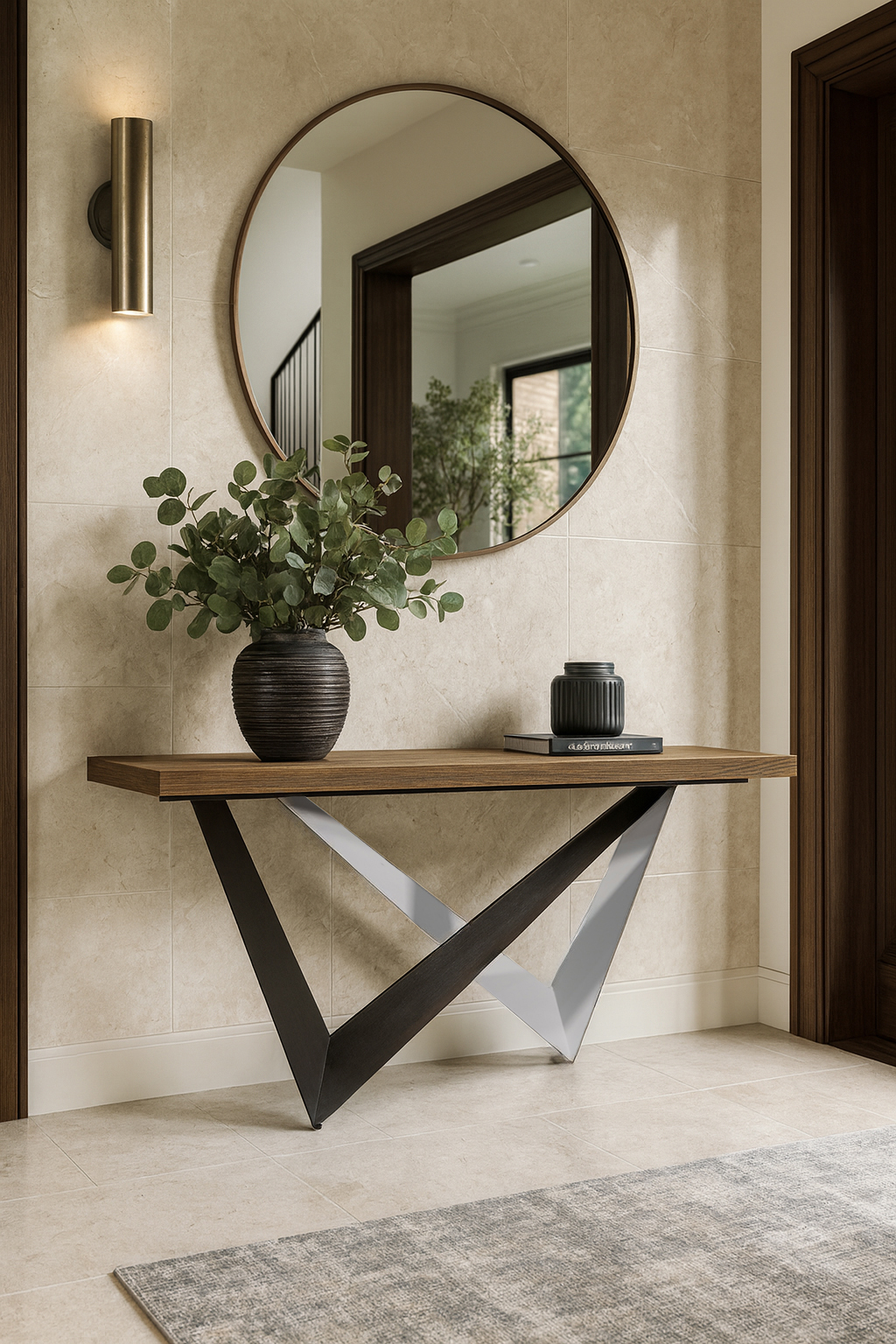 Κονσόλα με Ξύλινη Επιφάνεια και Μεταλλική Βάση σε Μοντέρνο Σχεδιασμό