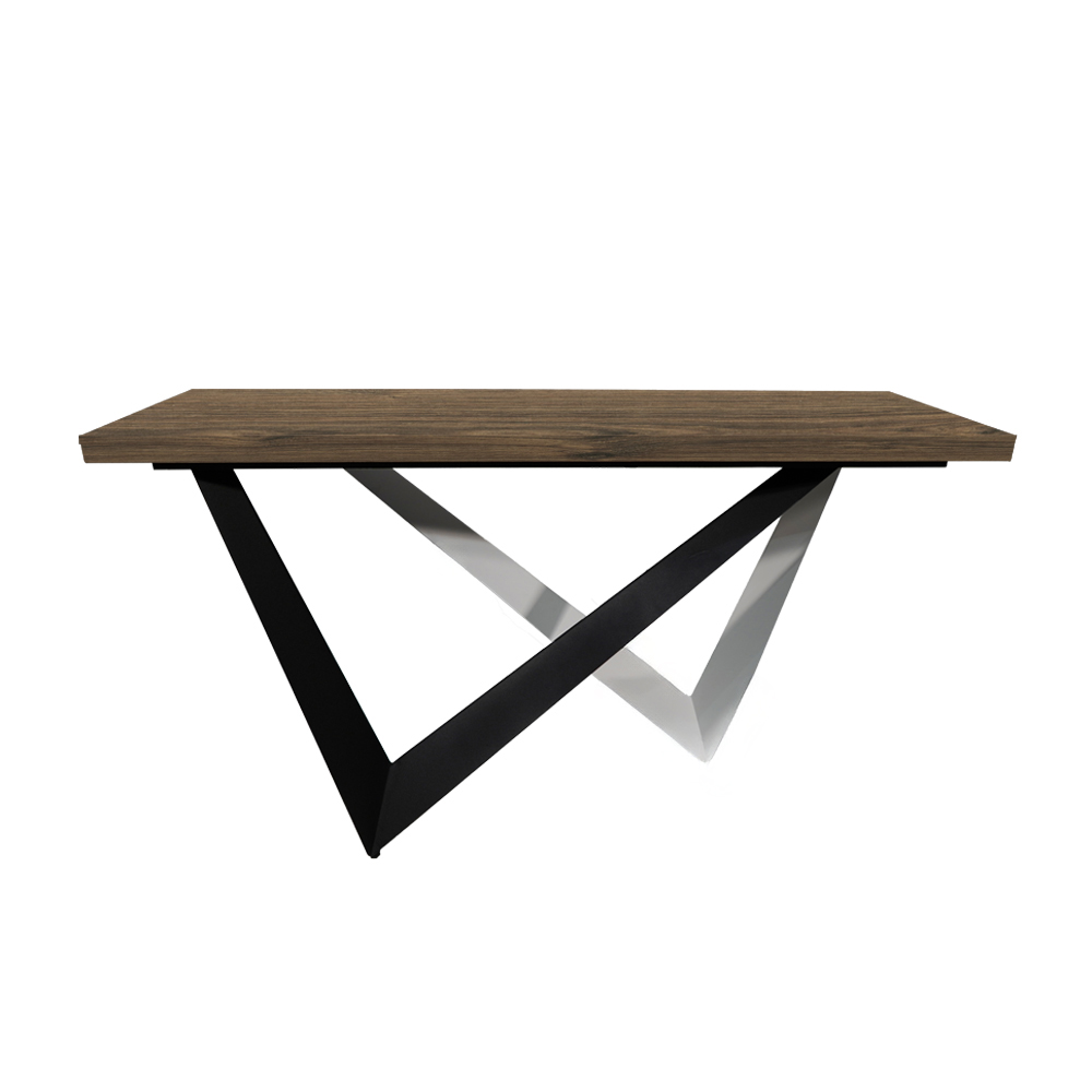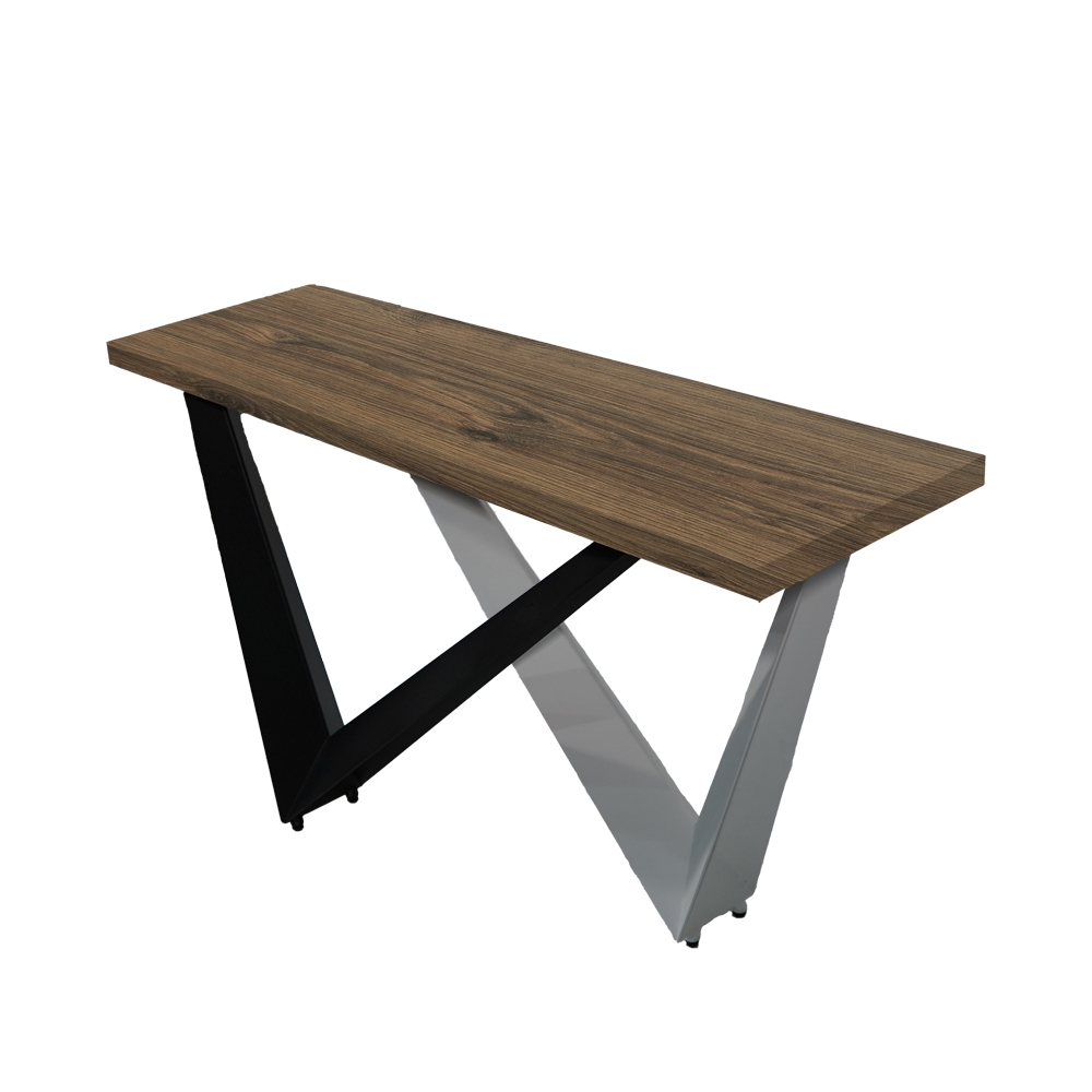 Ανανεώστε τον χώρο σας με αυτή τη μοντέρνα κονσόλα που συνδυάζει τη φυσική αισθητική του ξύλου με τον βιομηχανικό χαρακτήρα του μετάλλου. Η επιφάνειά της είναι κατασκευασμένη από υψηλής ποιότητας ξύλο σε σκούρο καφέ χρώμα με εμφανή νερά, προσδίδοντας ζεστασιά και κομψότητα. Η μεταλλική της βάση σε αντικριστό “V” σχεδιασμό – σε μαύρο και ασημί χρώμα – προσφέρει εξαιρετική σταθερότητα και μοναδικό οπτικό ενδιαφέρον.