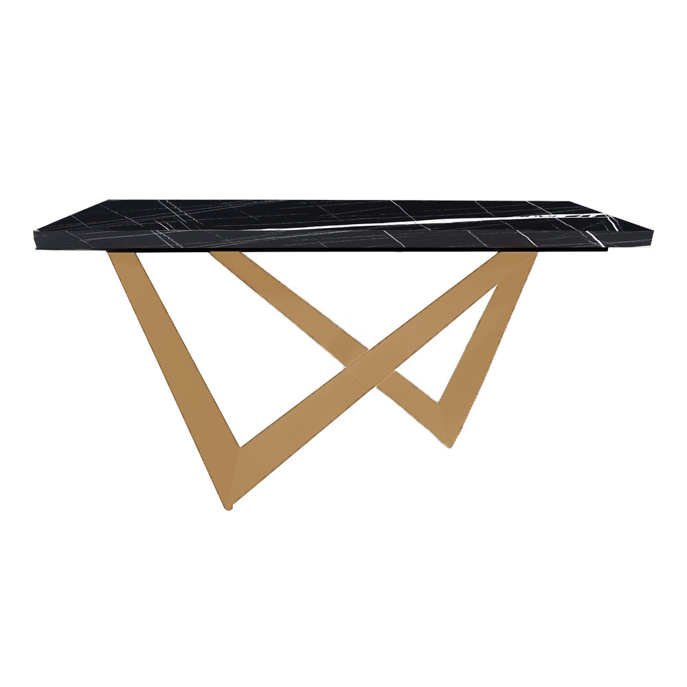 Αναδείξτε την είσοδο ή το σαλόνι σας με αυτή την εκλεπτυσμένη κονσόλα, που εντυπωσιάζει με το μοντέρνο και ταυτόχρονα διαχρονικό της design. Η εντυπωσιακή επιφάνεια τύπου μαύρου μαρμάρου με λευκές και χάλκινες φλέβες συνδυάζεται άψογα με μεταλλικά πόδια σε σχήμα “Χ” σε χρυσό χρώμα, προσφέροντας σταθερότητα και υψηλή αισθητική.