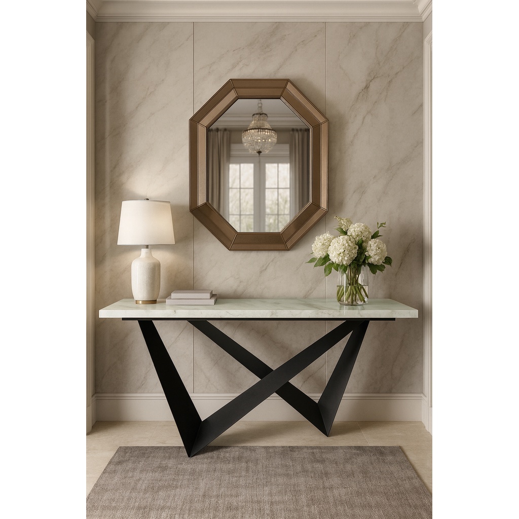 Δώστε μοντέρνο και δυναμικό χαρακτήρα στον χώρο σας με αυτή τη minimal και βιομηχανικού ύφους κονσόλα. Διαθέτει επιφάνεια σε υφή τσιμέντου που προσδίδει αίσθηση αυθεντικότητας και στιβαρότητας, ενώ η μεταλλική βάση σε σχήμα Χ ενισχύει την αισθητική και εξασφαλίζει σταθερότητα.