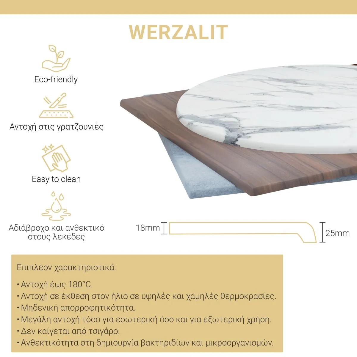 • Η επιφάνεια από Werzalit είναι ένα παράγωγο ξύλου υψηλής ποιότητας, ιδανικό για υψηλές αντοχές στην υγρασία, στο νερό, στην ηλιοφάνεια και στις υψηλές θερμοκρασίες.