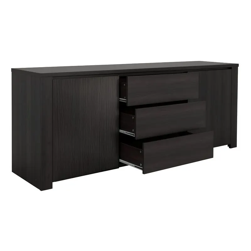 Ανακαλύψτε τον μπουφέ Kalya σε wenge απόχρωση με φυσικά νερά ξύλου, που συνδυάζει κομψότητα και πρακτικότητα, ιδανικός για να οργανώσει και να αναβαθμίσει τον χώρο σας. Διαθέτει δύο πλαϊνά ντουλάπια με εσωτερικά ράφια για διακριτική αποθήκευση και τρία κεντρικά συρτάρια για μικρότερα αντικείμενα. Η επιφάνειά του προσφέρει χώρο για διακοσμητικά, φωτιστικά ή προσωπικά αντικείμενα, ενώ η στιβαρή κατασκευή εξασφαλίζει μακροχρόνια ανθεκτικότητα. Ιδανικός για το σαλόνι, την τραπεζαρία ή κάθε χώρο που χρειάζεται στυλ και λειτουργικότητα.