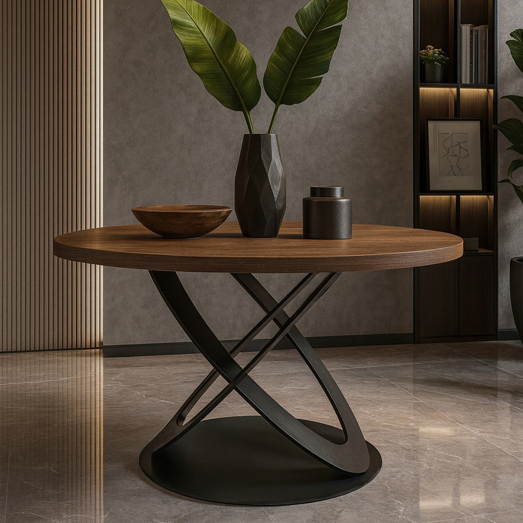 Επιφάνεια: Στρογγυλή επιφάνεια από υψηλής ποιότητας μελαμινη σε καρυδί απόχρωση, που προσδίδει ζεστασιά και κομψότητα.