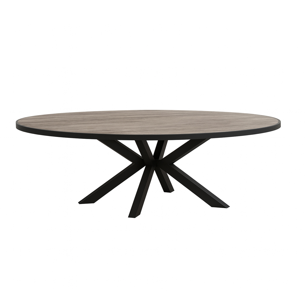 Αναβαθμίστε τον χώρο σας με αυτό το εκλεπτυσμένο οβάλ τραπέζι τραπεζαρίας που συνδυάζει σύγχρονη αισθητική και διαχρονική κομψότητα. Η επιφάνειά του διαθέτει μελαμίνη σε σταχτί απόχρωση, προσδίδοντας μια πολυτελή και μοντέρνα αίσθηση σε κάθε χώρο. Η μεταλλική μαύρη βάση τύπου “αστέρι” προσφέρει σταθερότητα και εντυπωσιακή σχεδιαστική ισορροπία, καθιστώντας το τραπέζι ιδανικό για κάθε σύγχρονο σπίτι ή επαγγελματικό περιβάλλον.