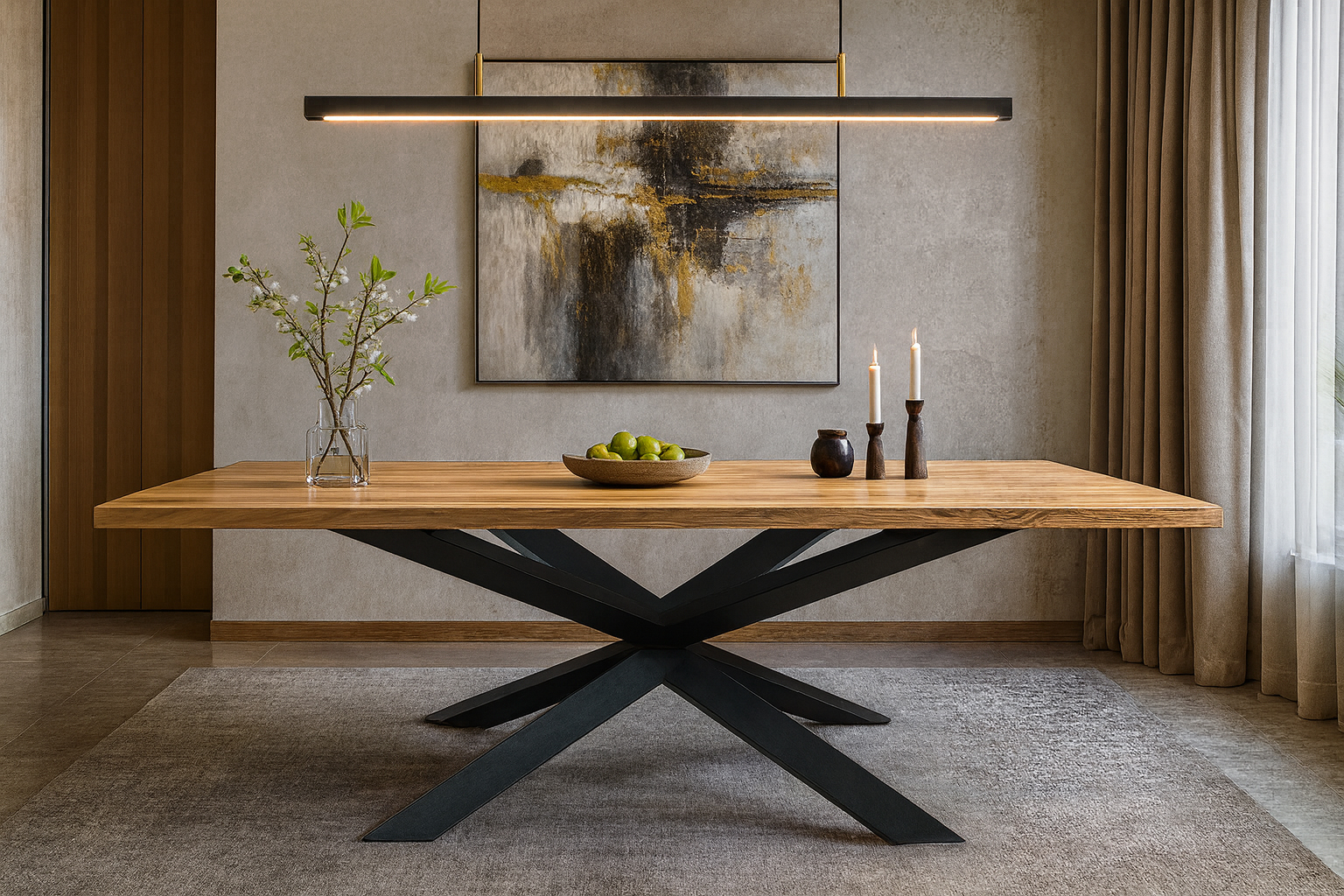 Η τραπεζαρία Spider είναι μια σύγχρονη πρόταση υψηλής αισθητικής, ιδανική για χώρους που συνδυάζουν κομψότητα, φυσικότητα και μοντέρνο χαρακτήρα. Η επιβλητική επιφάνεια από δρύ αναδεικνύει τη φυσική ομορφιά του υλικού, ενώ η μεταλλική βάση τύπου “X” σε μαύρο ματ φινίρισμα προσφέρει δυναμισμό και σταθερότητα.