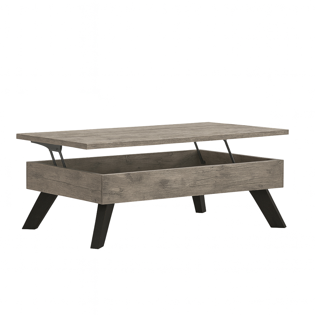 Η επιφάνεια ανυψώνεται εύκολα με μεταλλικούς μηχανισμούς, αποκαλύπτοντας ευρύχωρο αποθηκευτικό χώρο για αντικείμενα όπως τηλεχειριστήρια, περιοδικά ή ακόμα και laptop. Η σταθερή μεταλλική βάση σε μαύρη απόχρωση προσθέτει βιομηχανική αισθητική και εξασφαλίζει στιβαρότητα και αντοχή.