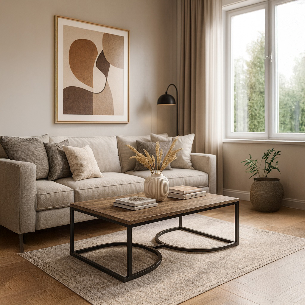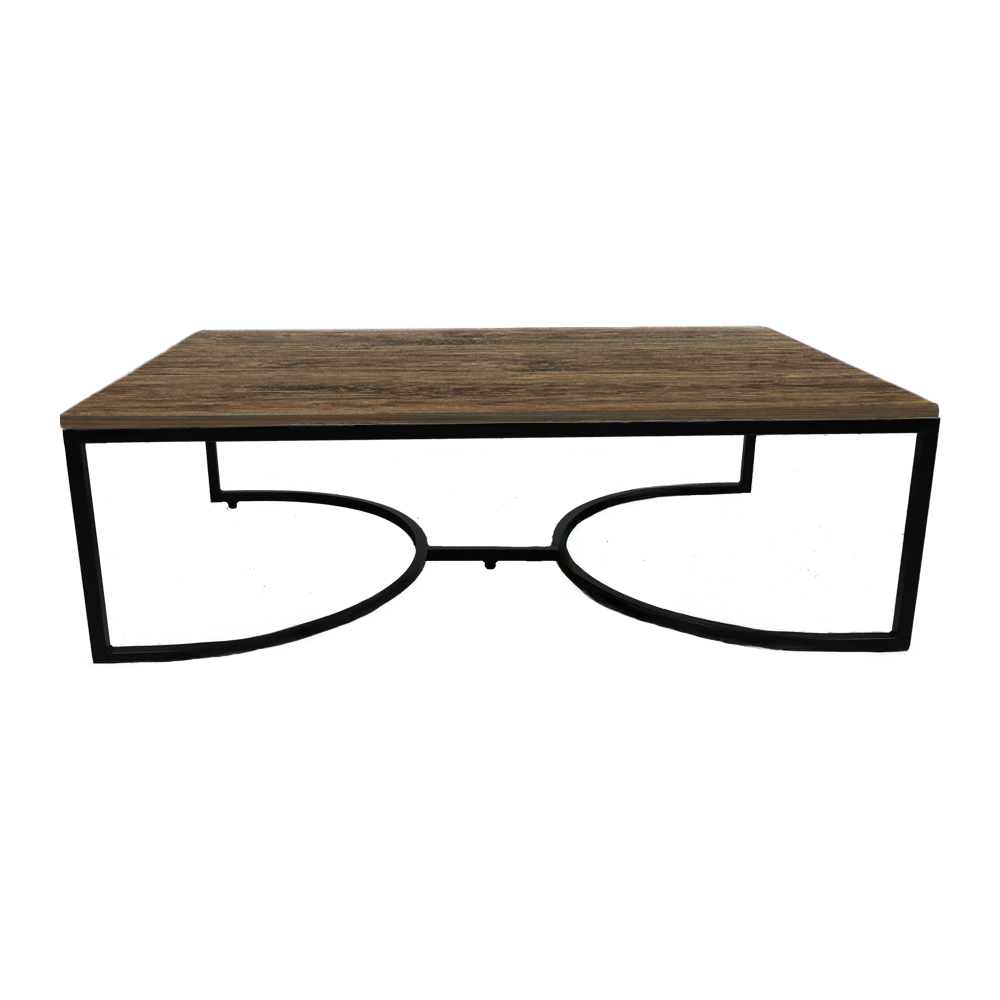 Ορθογώνιο τραπέζι σαλονιού με industrial αισθητική. Η επιφάνεια είναι κατασκευασμένη από μελαμίνη σε υφή ξύλου σε σκούρα καφέ απόχρωση, αναδεικνύοντας τη ζεστασιά και τον χαρακτήρα του χώρου. Η μεταλλική βάση σε μαύρο χρώμα διαθέτει μοναδικό γεωμετρικό σχέδιο, προσφέροντας σταθερότητα αλλά και ιδιαίτερη διακοσμητική αξία.