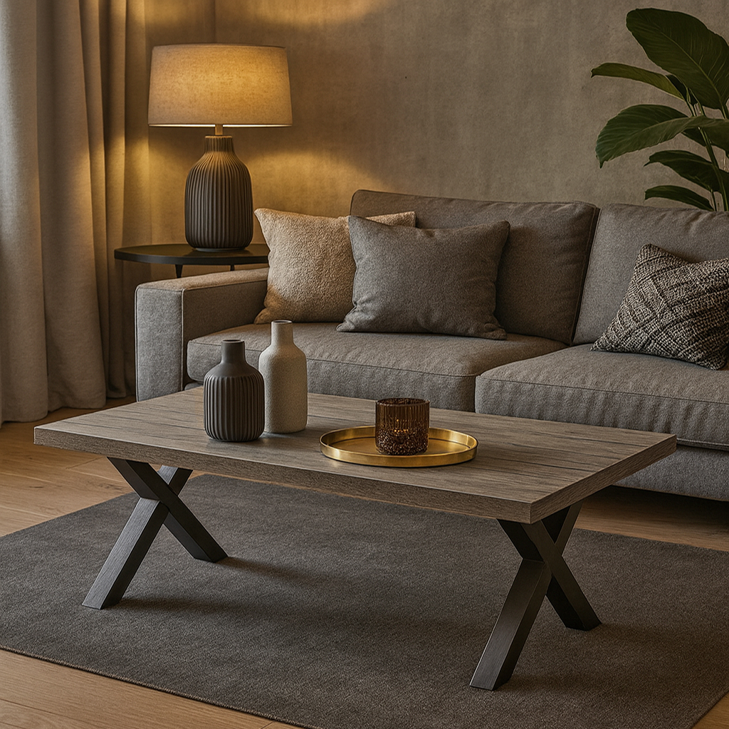 Αναβαθμίστε το σαλόνι σας με αυτό το εντυπωσιακό τραπέζι σαλονιού μοντέρνου σχεδιασμού, που συνδυάζει κομψότητα και ανθεκτικότητα. Η ορθογώνια επιφάνεια σε σταχτί απόχρωση προσδίδει μια αίσθηση ζεστασιάς, ενώ τα μεταλλικά πόδια σε σχήμα Χ χαρίζουν βιομηχανικό χαρακτήρα και εξαιρετική σταθερότητα.
