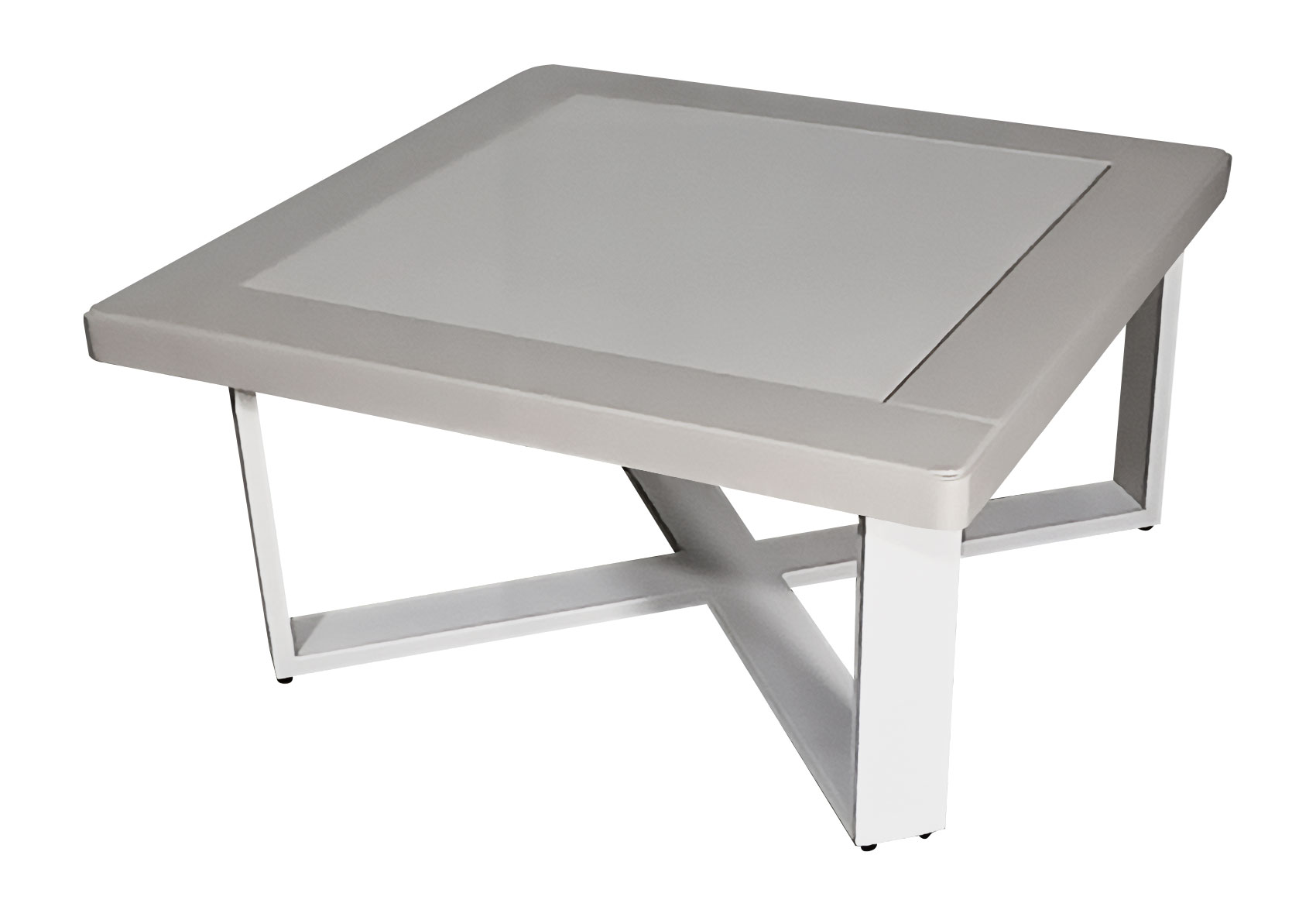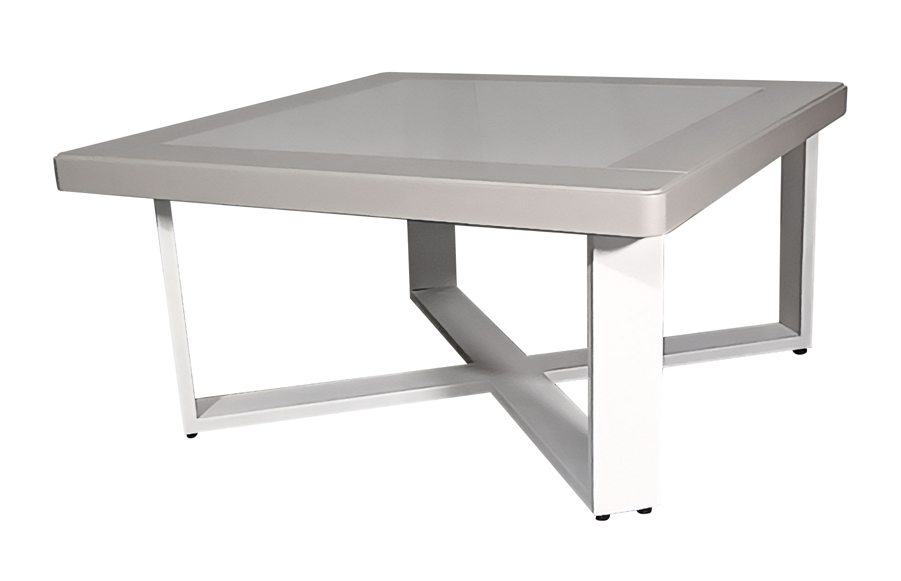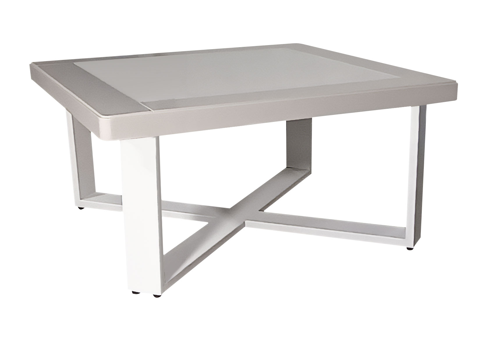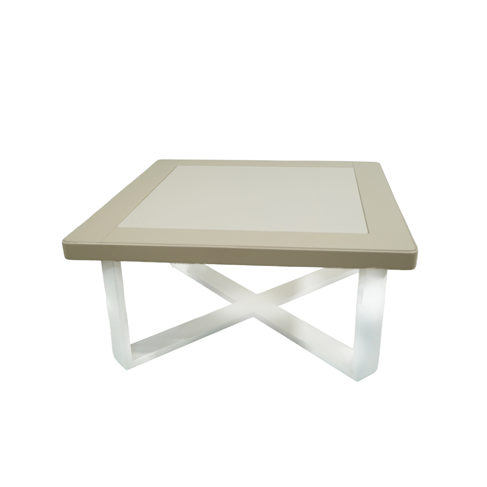 Το τραπέζι πλαισιώνεται από ξύλινη επιφάνεια σε λάκα χρώματος μπέζ, με διακριτικά στρογγυλεμένες γωνίες και στιβαρή χιαστί βάση σε λευκό χρώμα για απόλυτη σταθερότητα και στυλ.