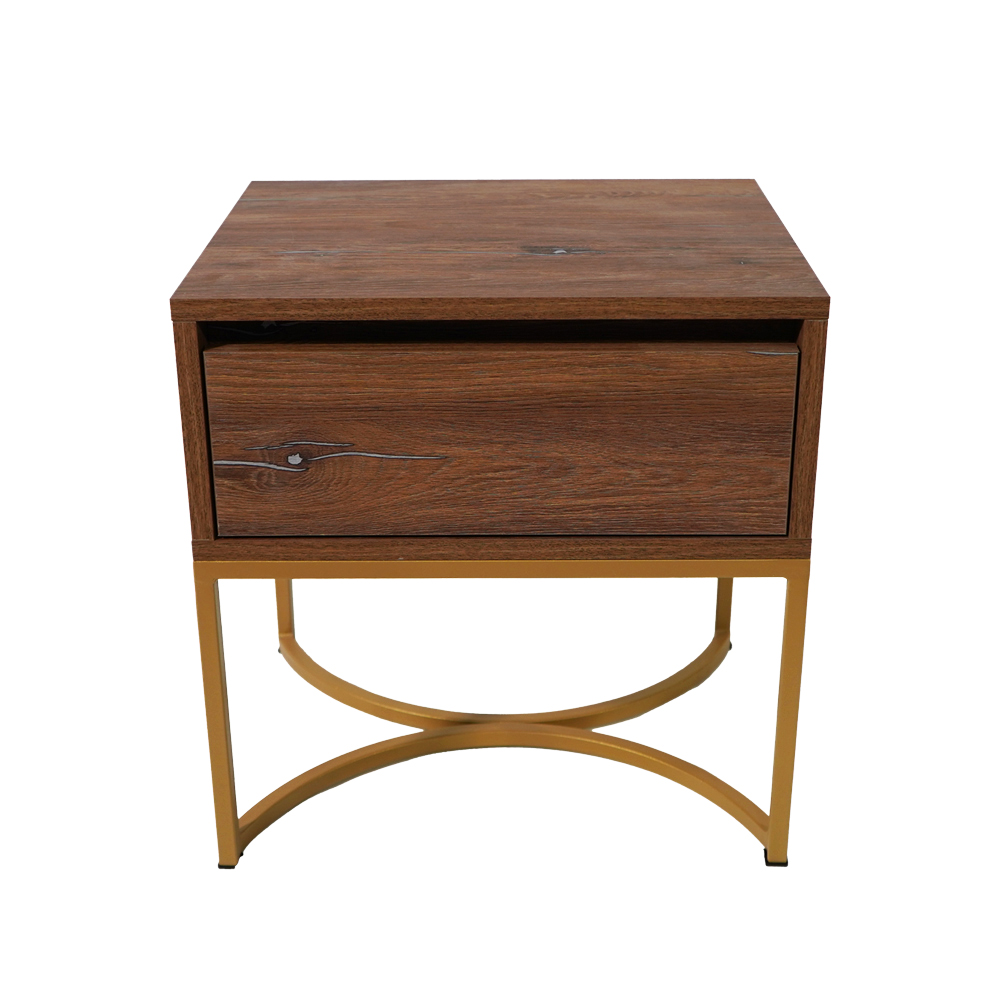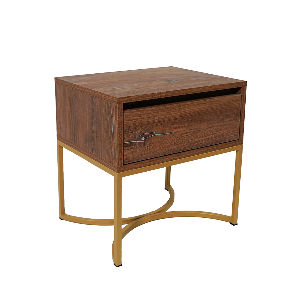 Φέρτε φυσική ζεστασιά και μοντέρνο χαρακτήρα στο υπνοδωμάτιό σας με αυτό το minimal κομοδίνο. Ολόκληρο το σώμα και το συρτάρι είναι κατασκευασμένα από μελαμινη με ρεαλιστική υφή και όψη καρυδιάς, χαρίζοντας αυθεντικότητα και κομψότητα. Η χρυσή μεταλλική βάση με καμπύλο design προσφέρει σταθερότητα και μοναδική αισθητική.
