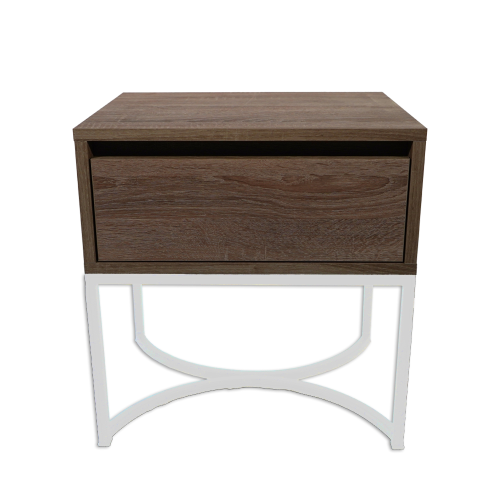 Φέρτε φυσική ζεστασιά και μοντέρνο χαρακτήρα στο υπνοδωμάτιό σας με αυτό το minimal κομοδίνο. Ολόκληρο το σώμα και το συρτάρι είναι κατασκευασμένα από μελαμινη με ρεαλιστική υφή και όψη φυσικού ξύλου, χαρίζοντας αυθεντικότητα και κομψότητα. Η λευκή μεταλλική βάση με καμπύλο design προσφέρει σταθερότητα και μοναδική αισθητική.