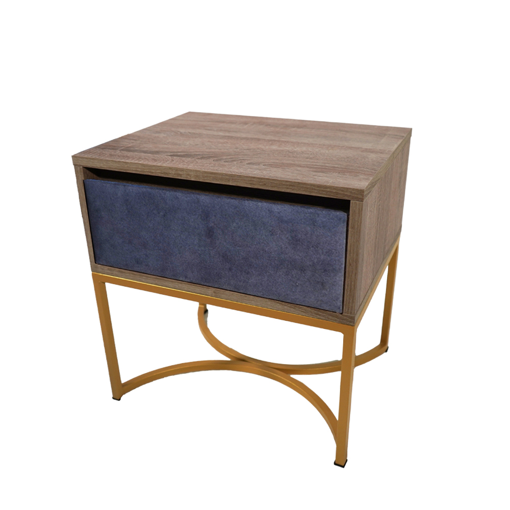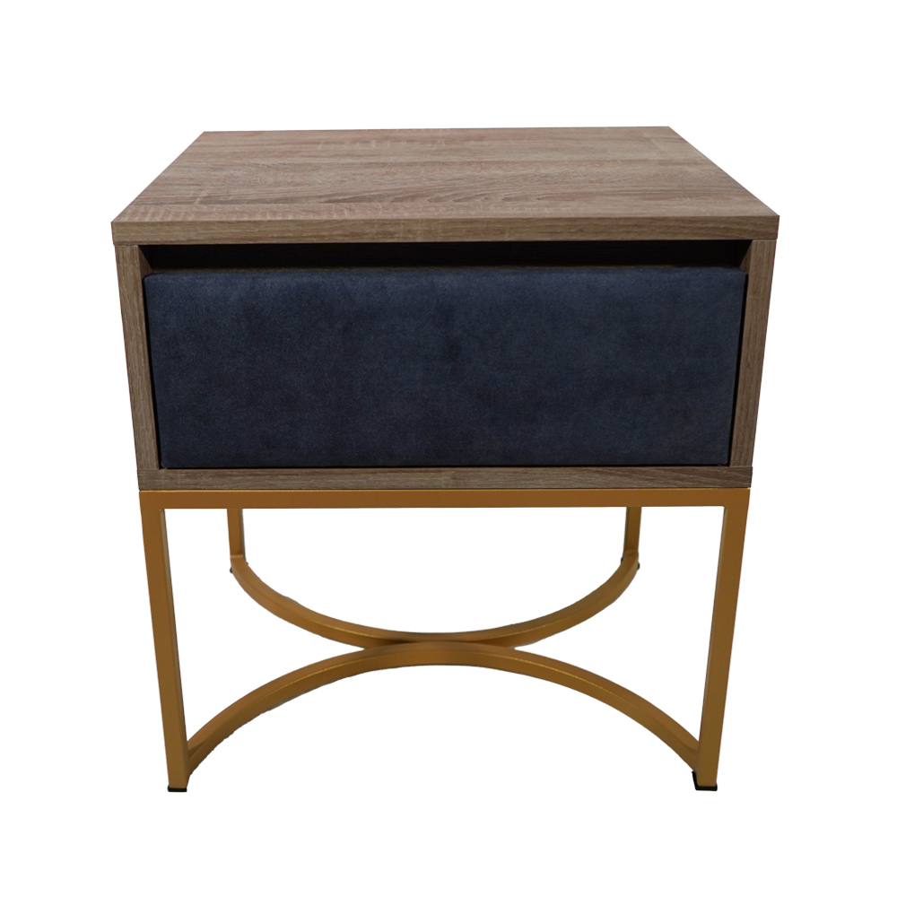 Ένα κομοδίνο που συνδυάζει τη μοντέρνα κομψότητα με τη διαχρονική αισθητική του ξύλου. Το σώμα του έχει όψη φυσικού ξύλου, προσδίδοντας ζεστασιά στον χώρο, ενώ το μπροστινό μέρος του συρταριού είναι επενδυμένο με πολυτελές ύφασμα σε βαθύ μπλε χρώμα, που δημιουργεί έναν ιδιαίτερο χρωματικό και υλικό contrast. Η βάση από μεταλλικό σκελετό σε ματ χρυσό δίνει ένα elegant και σταθερό φινίρισμα.