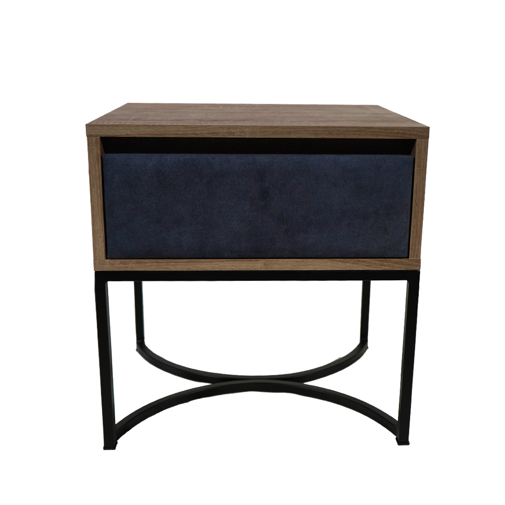 Ένα κομοδίνο που συνδυάζει τη μοντέρνα κομψότητα με τη διαχρονική αισθητική του ξύλου. Το σώμα του έχει όψη φυσικού ξύλου, προσδίδοντας ζεστασιά στον χώρο, ενώ το μπροστινό μέρος του συρταριού είναι επενδυμένο με πολυτελές ύφασμα σε βαθύ μπλε χρώμα, που δημιουργεί έναν ιδιαίτερο χρωματικό και υλικό contrast. Η βάση από μεταλλικό σκελετό σε μαυρο δίνει ένα elegant και σταθερό φινίρισμα.