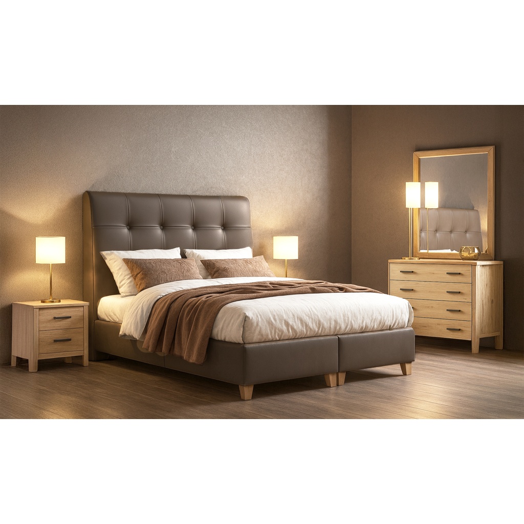 Σετ κρεβατοκάμαρας με τεχνόδερμα και μοντέρνο σχεδιασμό που προσφέρει αρμονία και άνεση στον χώρο. Περιλαμβάνει κρεβάτι με κομψό κεφαλάρι, δύο πρακτικά κομοδίνα, λειτουργική τουαλέτα και καθρέφτη. Ιδανική επιλογή για ένα ολοκληρωμένο και καλαίσθητο υπνοδωμάτιο.
