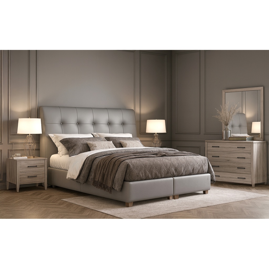 Σετ κρεβατοκάμαρας με τεχνόδερμα και μοντέρνο σχεδιασμό που προσφέρει αρμονία και άνεση στον χώρο. Περιλαμβάνει κρεβάτι με κομψό κεφαλάρι, δύο πρακτικά κομοδίνα, λειτουργική τουαλέτα και καθρέφτη. Ιδανική επιλογή για ένα ολοκληρωμένο και καλαίσθητο υπνοδωμάτιο.